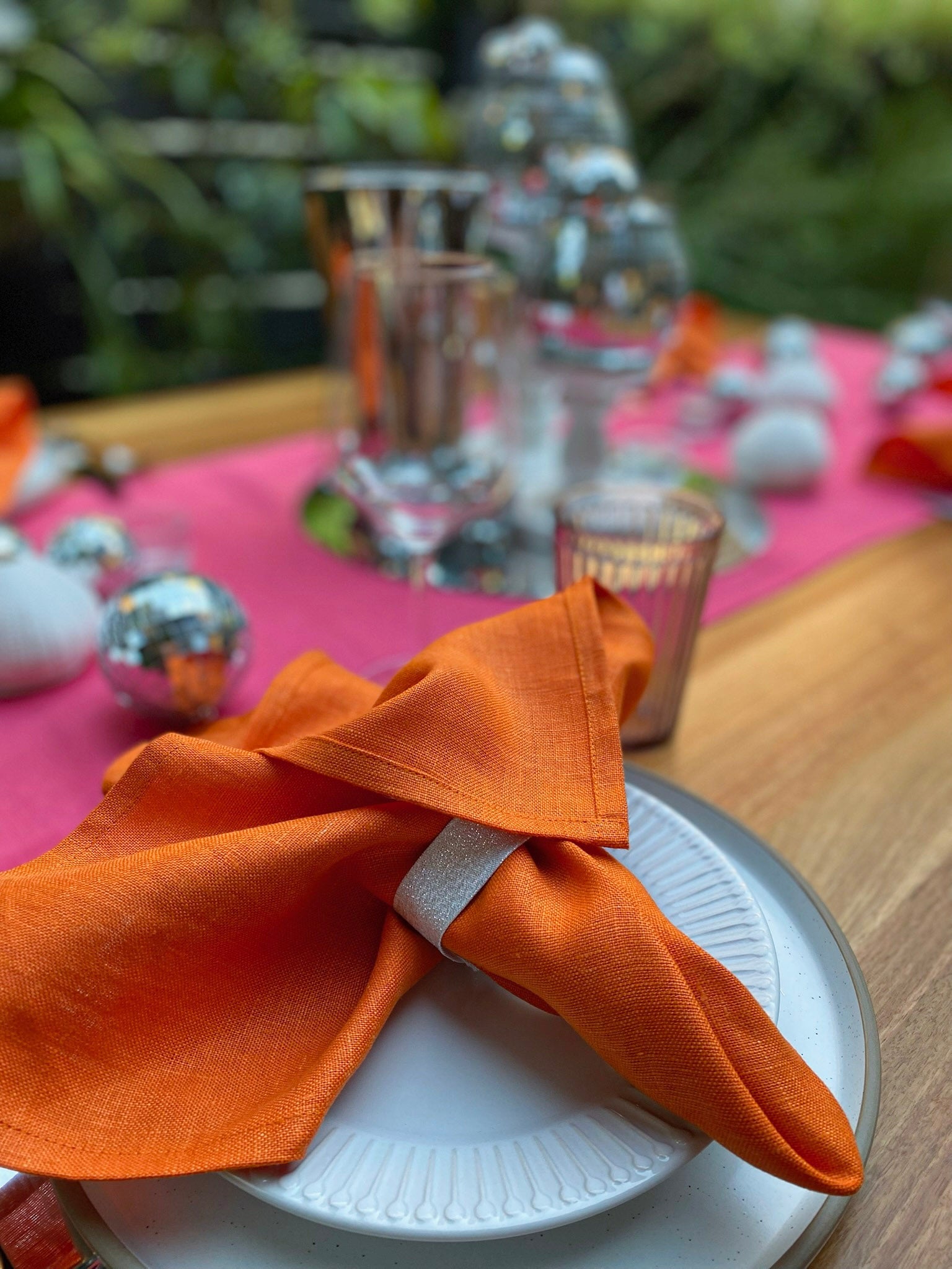 Dreaming of a table setting that’s 100% you? Whether it’s a wedding, milestone birthday, long lunch, or the dinner party to end all dinner parties, we custom-dye our linens to match your vision — right down to the Pantone.