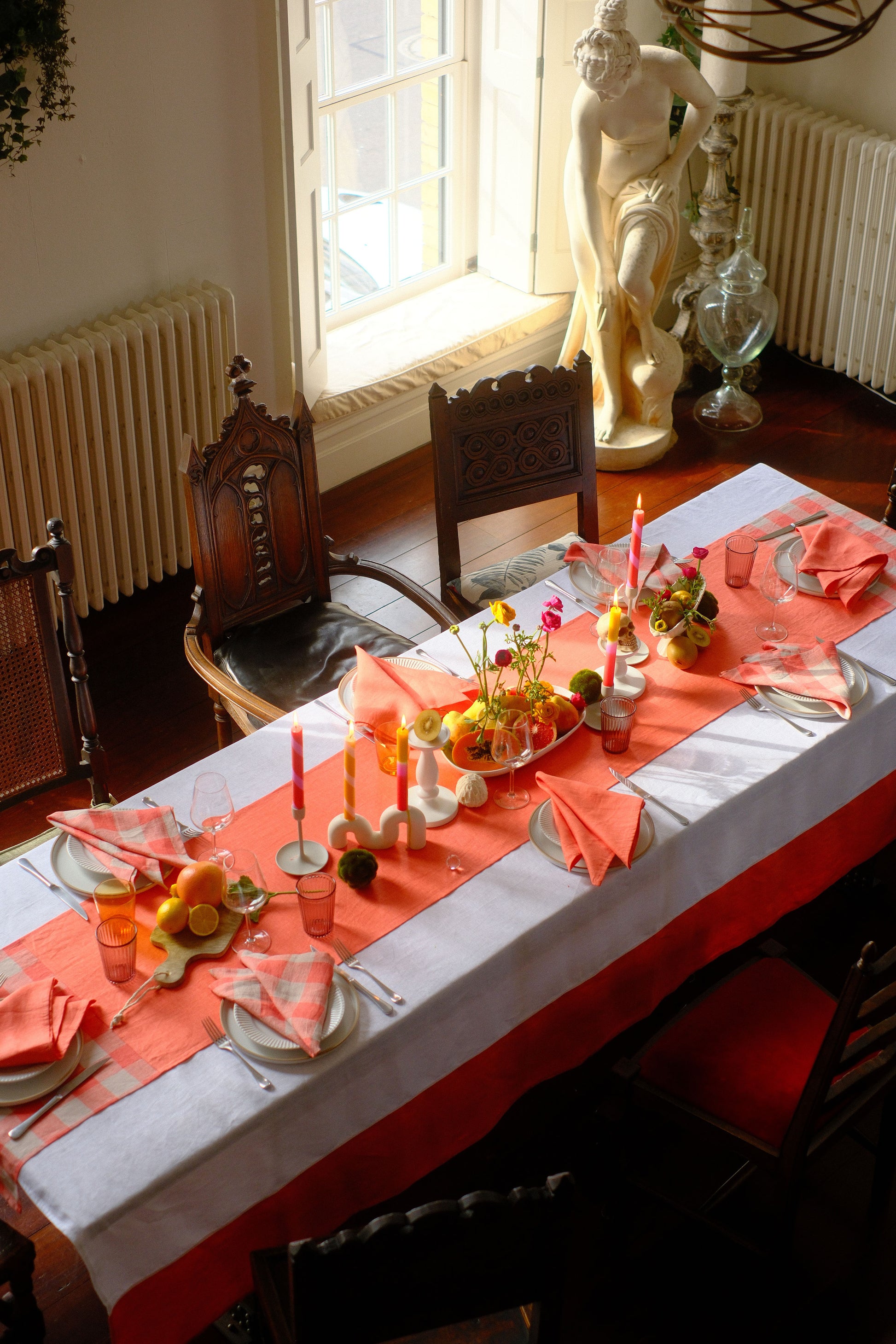 Turn every meal into a seaside escape with our Grapefruit Linen Tablecloth. Featuring a crisp white base and a bold coral edge, this 100% European flax linen tablecloth is equal parts playful and polished. Perfect for long lunches, sunset dinners, or adding a touch of festive chic to your everyday table.