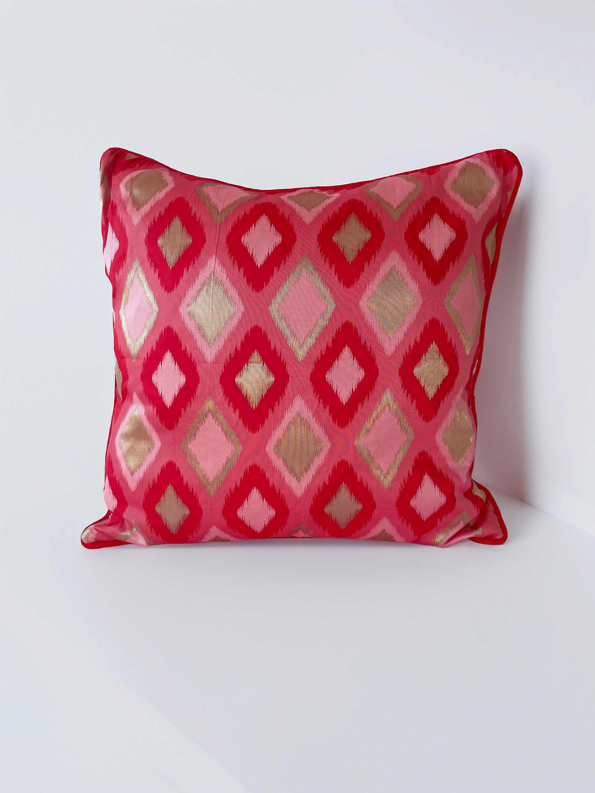 Bold, bright, and unapologetically fabulous — this diamond-patterned cushion is not here to blend in. Featuring rich tones of hot pink, red, blush, and gold in a striking Ikat weave, it’s finished with contrast red piping for that extra polish.