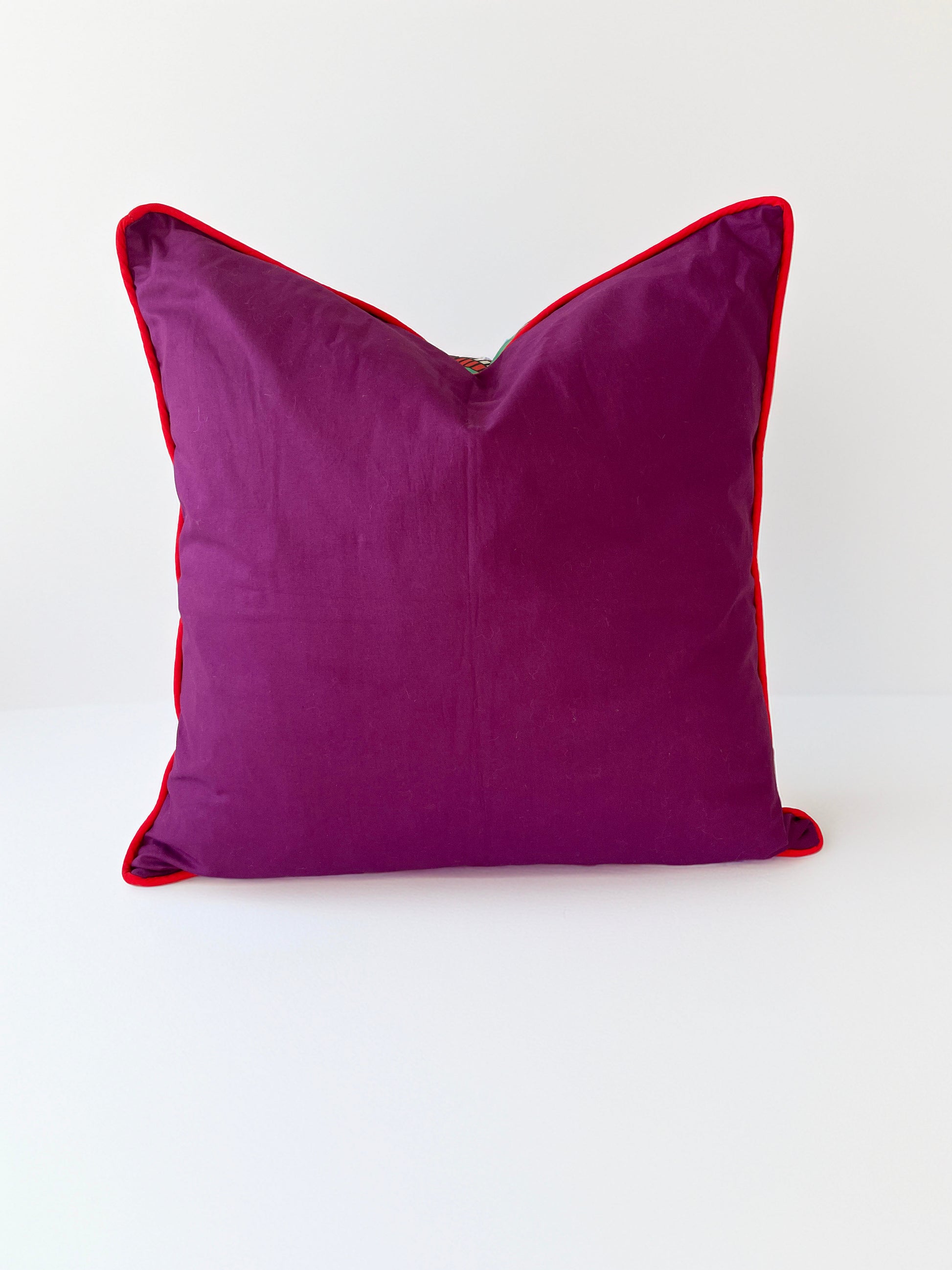 Finished with contrast red piping (because why not?), this piece is made for mixing, layering, and stealing the show on any sofa.