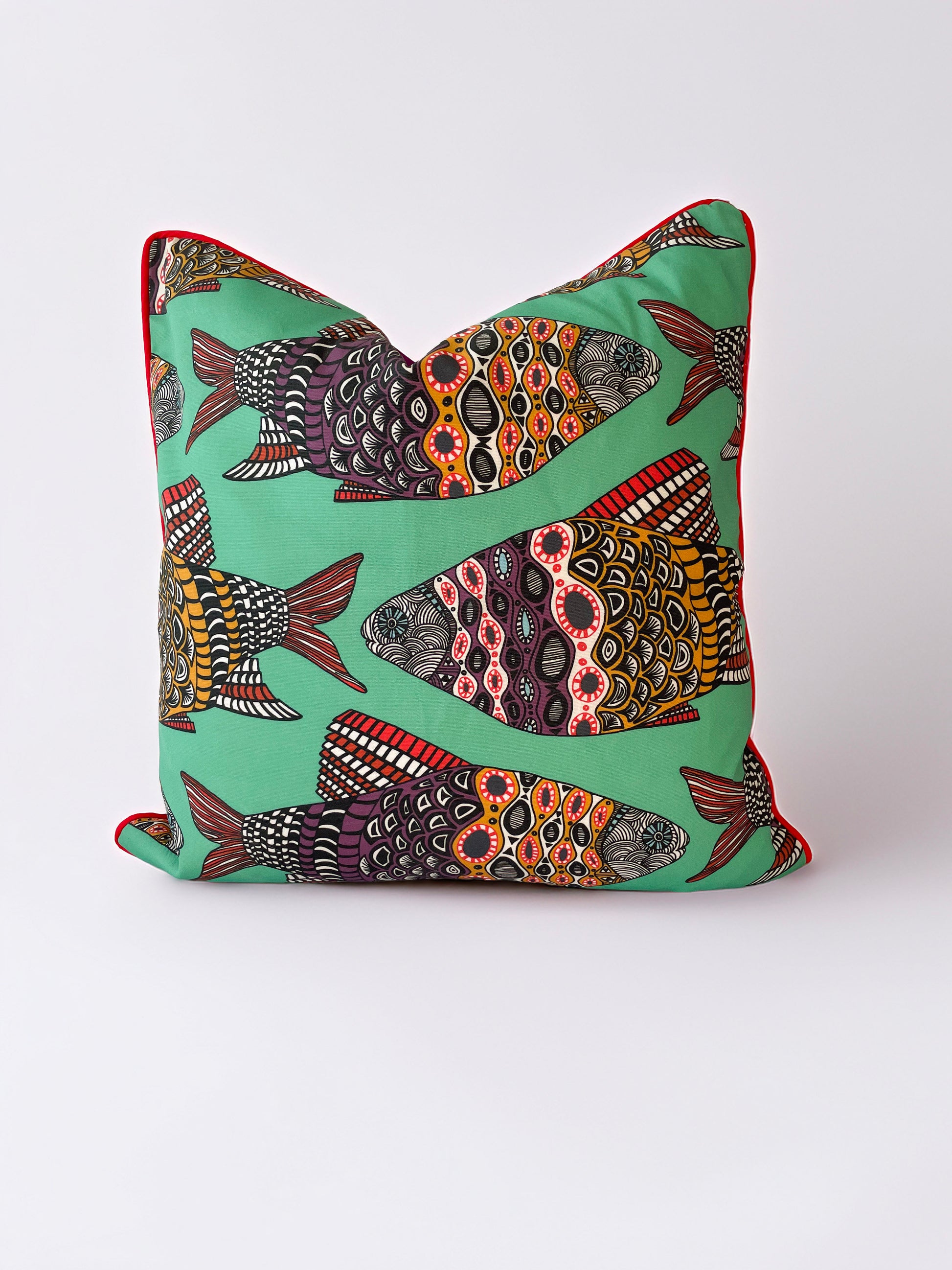 Make a splash. Inspired by the vibrant textiles of Mozambique, this statement cushion features a bold fish motif in rich jewel tones — all set on a sea-green background that brings the energy. The front is crafted from 100% Pan (dralon) for a smooth, durable finish, while the deep purple cotton back keeps things grounded. These cushions are more suited to outside due to the nature of the fabric but go ahead, break the mold and use them indoors.